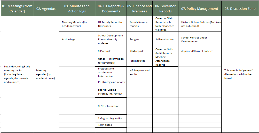 Here is an example of the folders and sub folders that might be useful for your GVO in each school - this might be a useful 'starter-for-ten'. In a single school GVO these folders might be top-level, in a MAT they will sit under each Local Governing Board. Similar folders structures can exist for each committee (if you have committees).