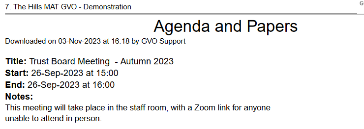 a) Any file access restrictions with links (Agenda Items) are respected with a message saying 'You do not have access to this file' - so the meeting pack download may not be identical for all Governors/Trustees depending if certain items are restricted