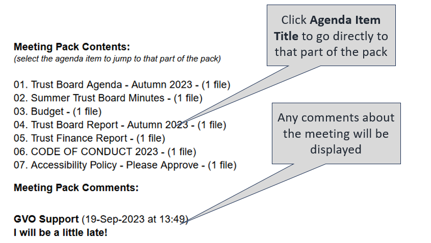 This is followed by the list of agenda items...these are BOOKMARKS for each Agenda Item that allow you to go straight to that item in the pack (useful if the pack is large). Any comments added about the meeting itself are also displayed.